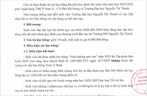 Xem chi tiết thông báo tại đây: Thông báo Về việc tiếp nhận hồ sơ xét Học bổng Nam A Bank dành cho sinh viên...