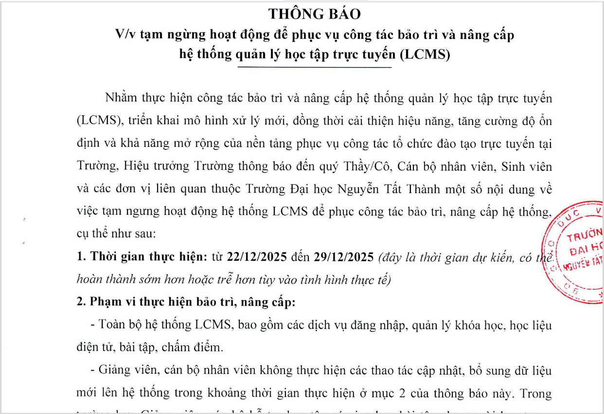 Thông báo về việc tạm ngừng hoạt động để phục vụ công tác bảo trì và nâng cấp hệ thống quản lý học tập trực tuyến (LCMS) Xem chi tiết thông báo tại: Thông báo về việc tạm ngừng hoạt động để phục vụ công tác bảo trì và nâng cấp hệ thống quản lý học tập trực tuyến (LCMS) Đọc thêm: THÔNG BÁO Về việc đăng ký học phần, đóng học phí học kỳ 2 năm học 2025 – 2026 Trường ĐH Nguyễn Tất Thành tổ chức Ngày hội Khởi nghiệp và Hội thảo “Từ ý tưởng đến thực thi”