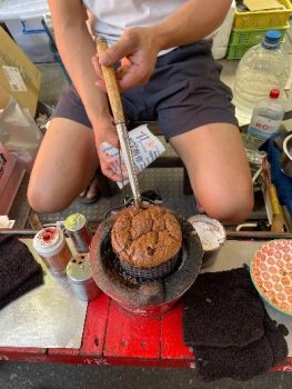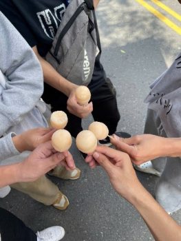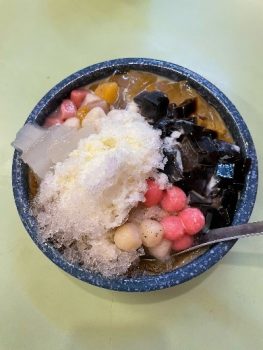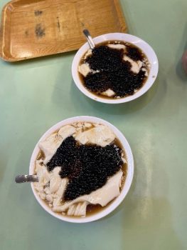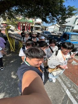 We then took a break for lunch at the Old Street of Anping. At lunchtime, the entire group was divided into four teams to film and introduce traditional local dishes. I was with Group 2, and we filmed a traditional dessert, famous shrimp crackers, and pickled plums. Each group had to introduce their chosen dish, explaining its origins and preparation. After completing the task, the first group received a special reward. We were delighted to complete our task and received compliments from teachers and peers.