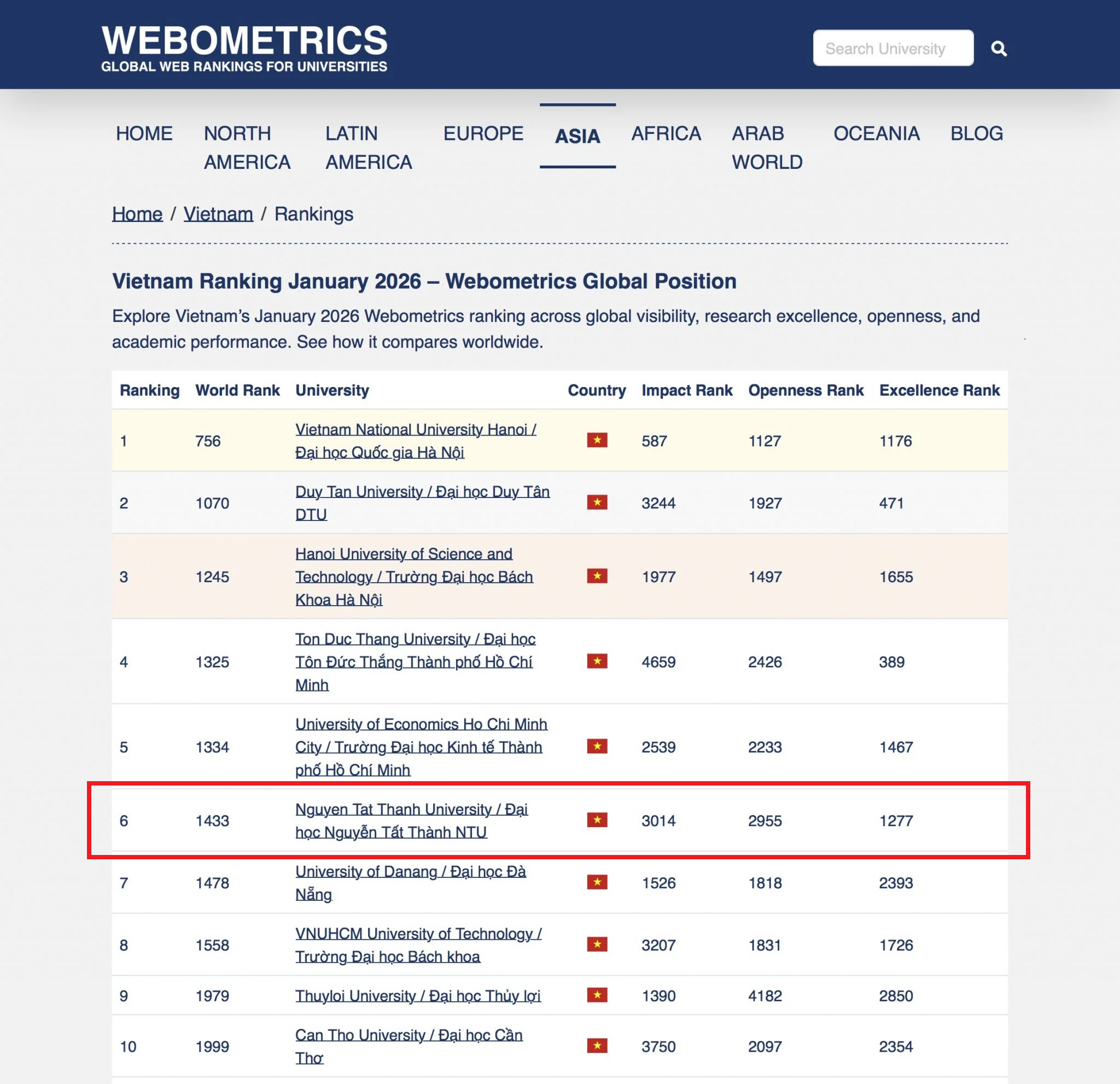 Năm 2026, Webometrics thực hiện xếp hạng hơn 32.000 cơ sở giáo dục đến từ hơn 200 quốc gia và vùng lãnh thổ trên toàn thế giới. Trong kỳ xếp hạng này, Trường ĐH Nguyễn Tất Thành vinh dự góp mặt trong nhóm 1.500 cơ sở giáo dục đại học hàng đầu toàn cầu, khẳng định uy tín và vị thế ngày càng nâng cao trên bản đồ giáo dục quốc tế.